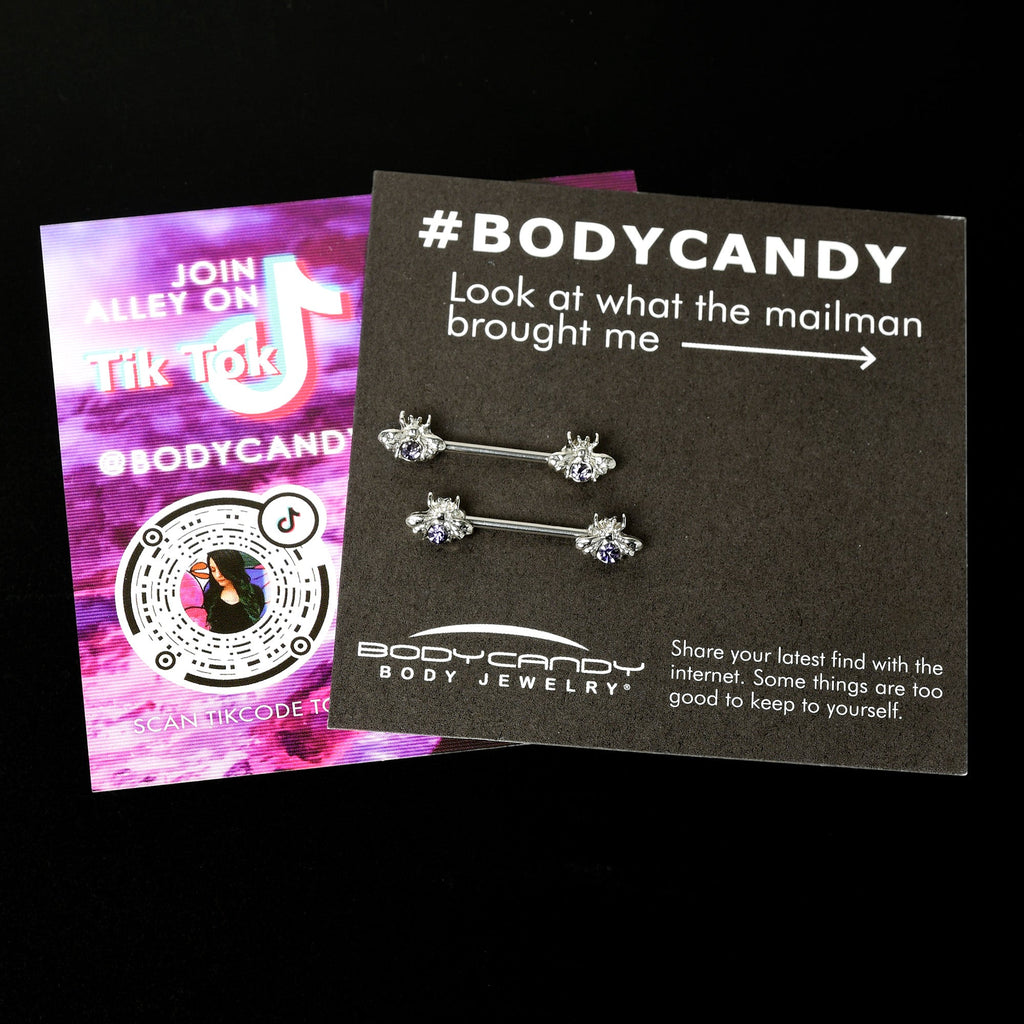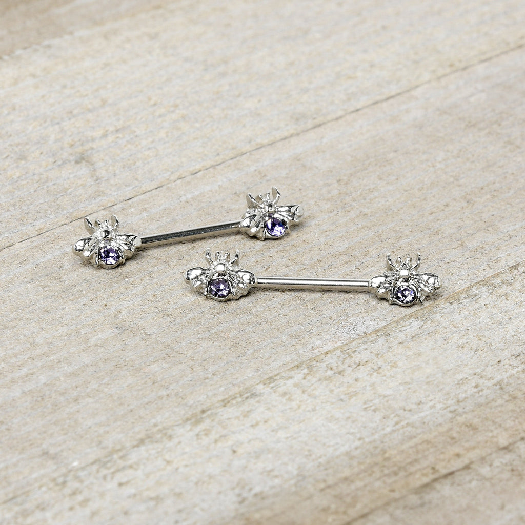 This 14 gauge nipple jewelry is sure to give you one honey of a new look! It's made with 14mm durable 316L surgical grade stainless steel straight barbells. Each of the ends features a bee charm, with the body composed of a single large purple gem. They also features stylized wings and legs for a realistic and airy appearance. These unconventional insect nipple piercing rings are sure going to make your nipple piercings look super sweet! Sold as a set of two.