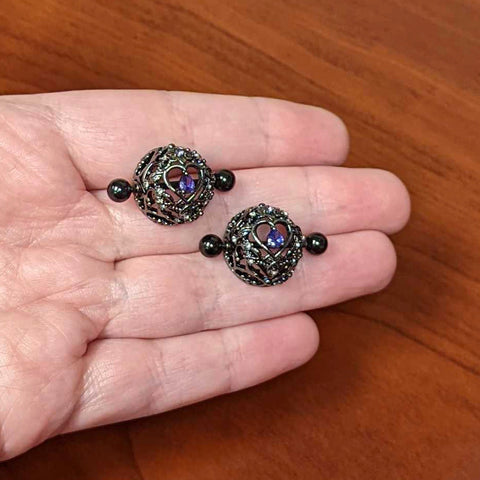 Crown your nipple piercings in style with these elegant 14 gauge nipple piercing rings! They're made with 14mm black PVD over 316L surgical grade stainless steel straight barbells with 5mm ball ends. The shield portion resembles a lacy crown charm, with a heart at the center. At the central point of the crown is a purple gem and there is a flower embellishment at the top of the shield, set with another purple gem. Rock these regal crowns and feel like the royalty you are with these elegant, aristocratic nipple shields! Sold as a set of two.Specifications
