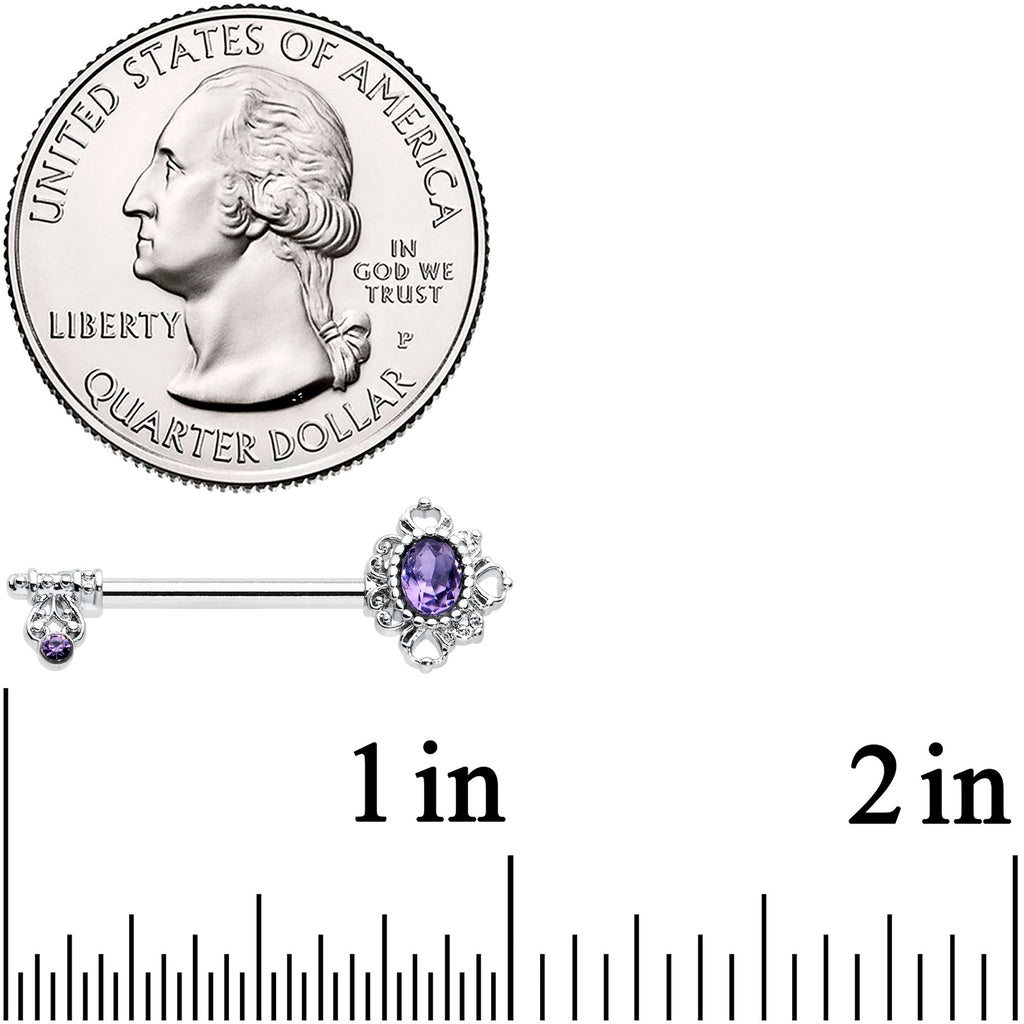 Unlock a whole new look with this 14 gauge nipple jewelry! It's made with 14mm durable 316L surgical grade stainless steel straight barbells. One end features the key's bow, composed of openwork hearts and set with a large purple gem at the center. The other end is the key's bit, embellished with a matching purple gem for a cohesive appearance. Unlock a look you're going to love with these classic, key-themed nipple piercing rings! Sold as a set of two.Specifications