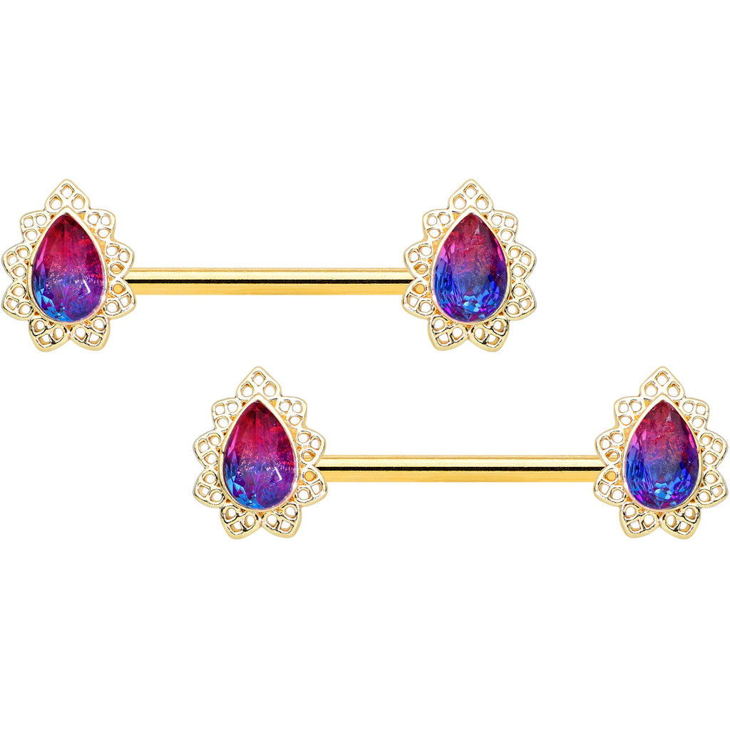 You'll be shedding no tears when you check out this 14 gauge nipple jewelry! It's made with 14mm gold tone PVD over 316L surgical grade stainless steel straight barbells. Each of the ends features a drop shaped purple tourmaline drop charm, with fringe-inspired detailing around the edges. You don't have to cry for new nipple piercing jewelry when you have these elegant nipple rings! Sold as a set of two.Specifications