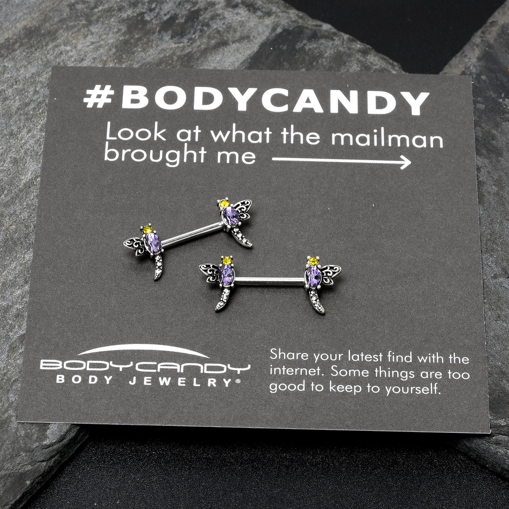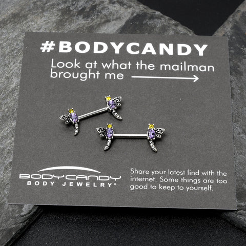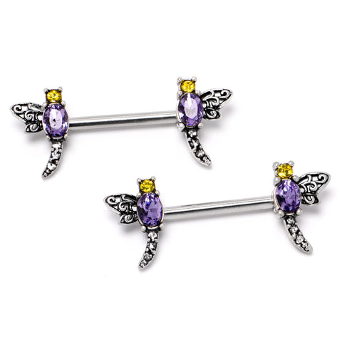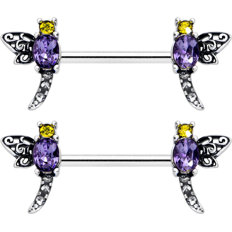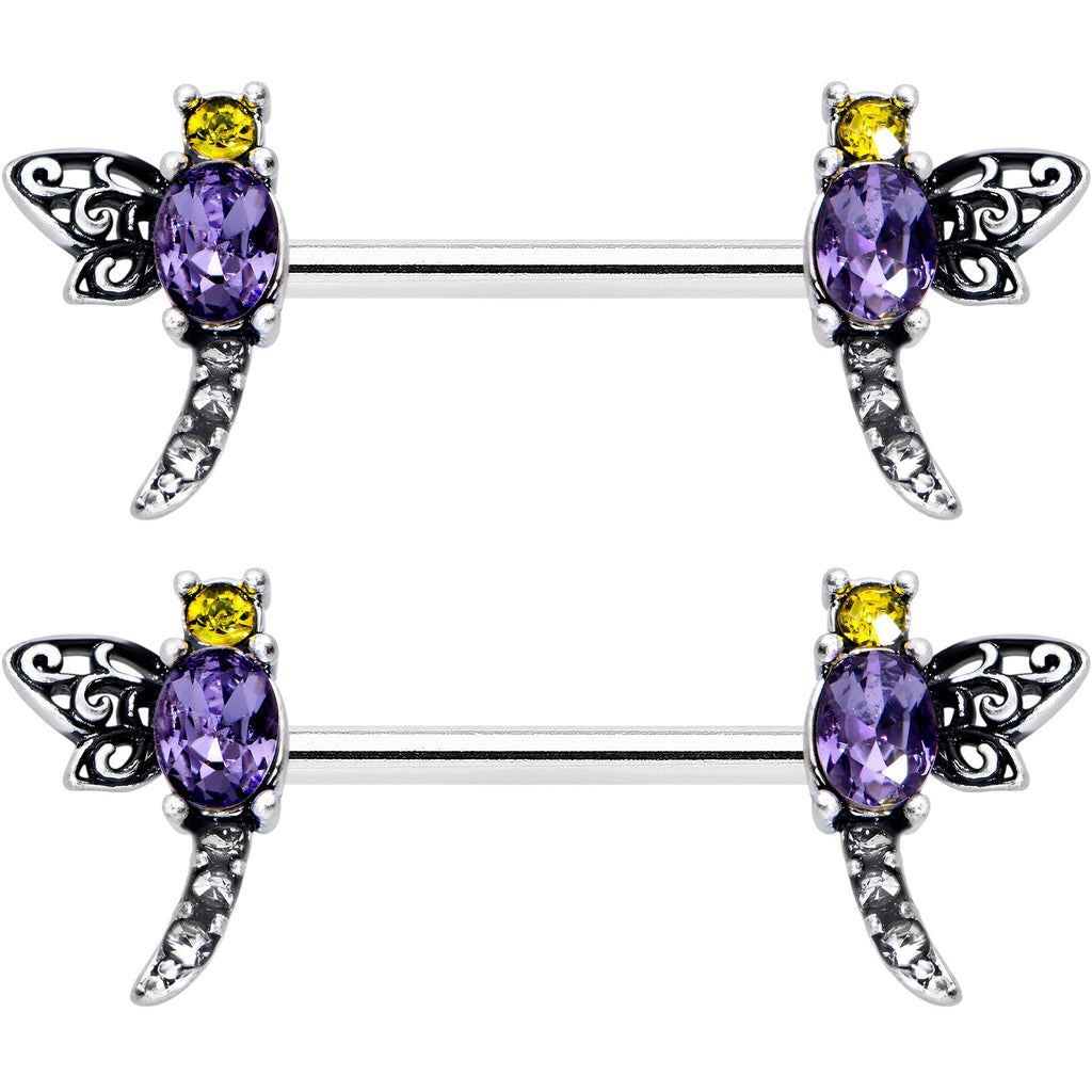 14 Gauge 9/16 Purple Yellow Gem Dragonfly Barbell Nipple Ring Set