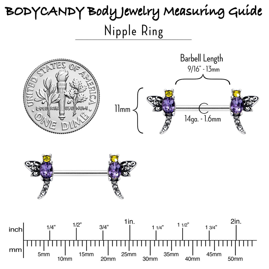 The delightful dragonflies on this 14 gauge nipple jewelry are so lovely it is almost magical. It is made with 14mm durable 316L surgical grade stainless steel straight barbells. Each end features a dragonfly charm, with openwork wings and cohesive detailing that won't overwhelm. They also feature a purple gem body and yellow gem head for a striking touch of color that will cast a spell on you, as well as clear gems in their tails. Give your nipple piercings a touch of nature with these delicious dragonfly nipple piercing rings.Sold as a set of two.Specifications