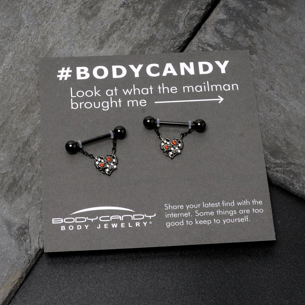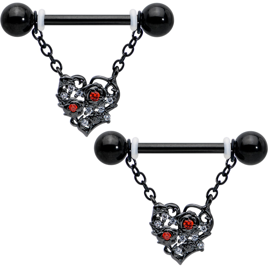 14G 9/16 Red CZ Gem Black Floral Heart Chain Dangle Nipple Ring Set