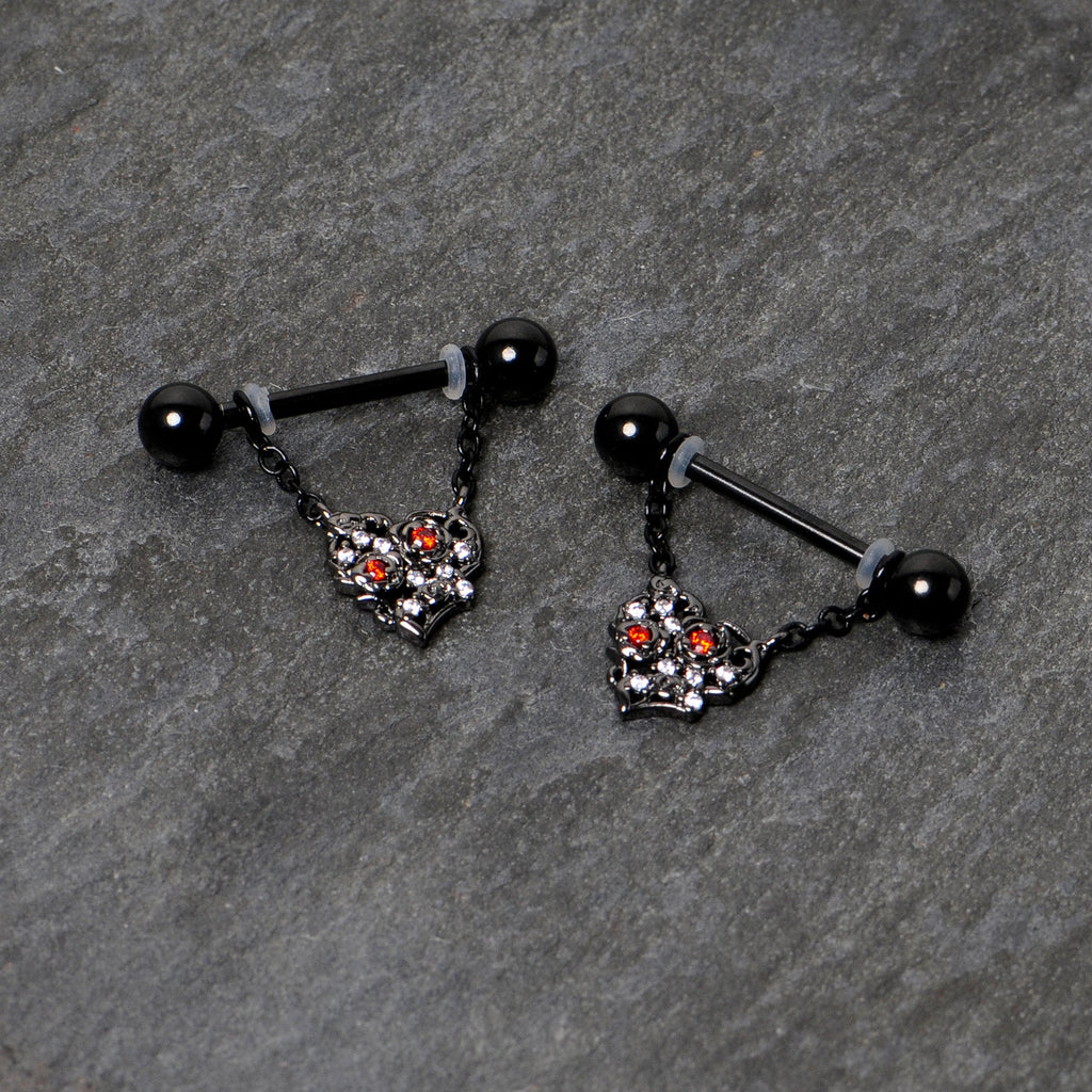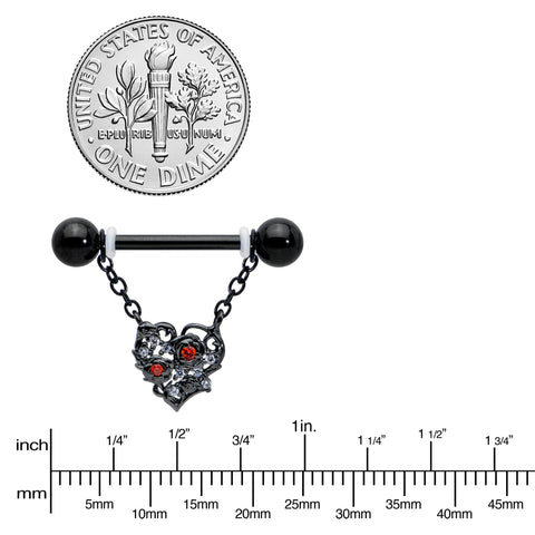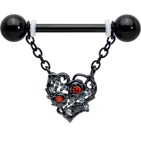14 Gauge 9/16 Red CZ Gem Black Floral Heart Chain Dangle Nipple Ring Set