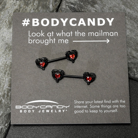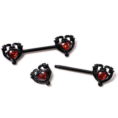 14 Gauge 9/16 Red CZ Gem Black Passion Heart Barbell Nipple Ring Set