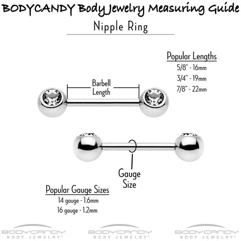 Get an antique-inspired look that will steal your heart with this 14 gauge nipple jewelry! It's made with 14mm black PVD over 316L surgical grade stainless steel straight barbells. Each of the ends features a double heart charm, with the outer heart twining to give it a look that's both timeless and elegant. The inner hearts are composed entirely of a single red cubic zirconia gem. Wear your heart on your sleeve and in your piercings with these gothic nipple piercing rings! Sold as a set of two.Specifications