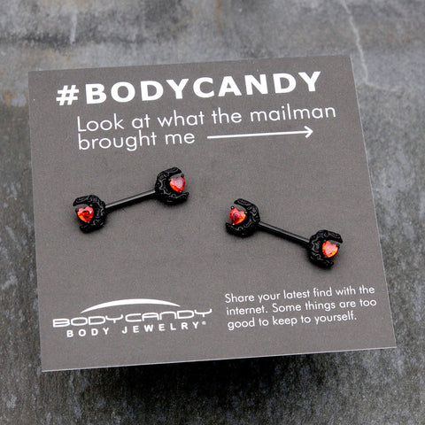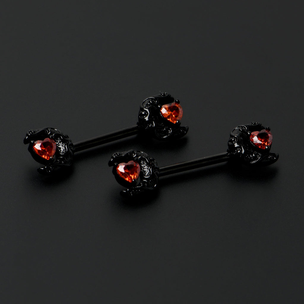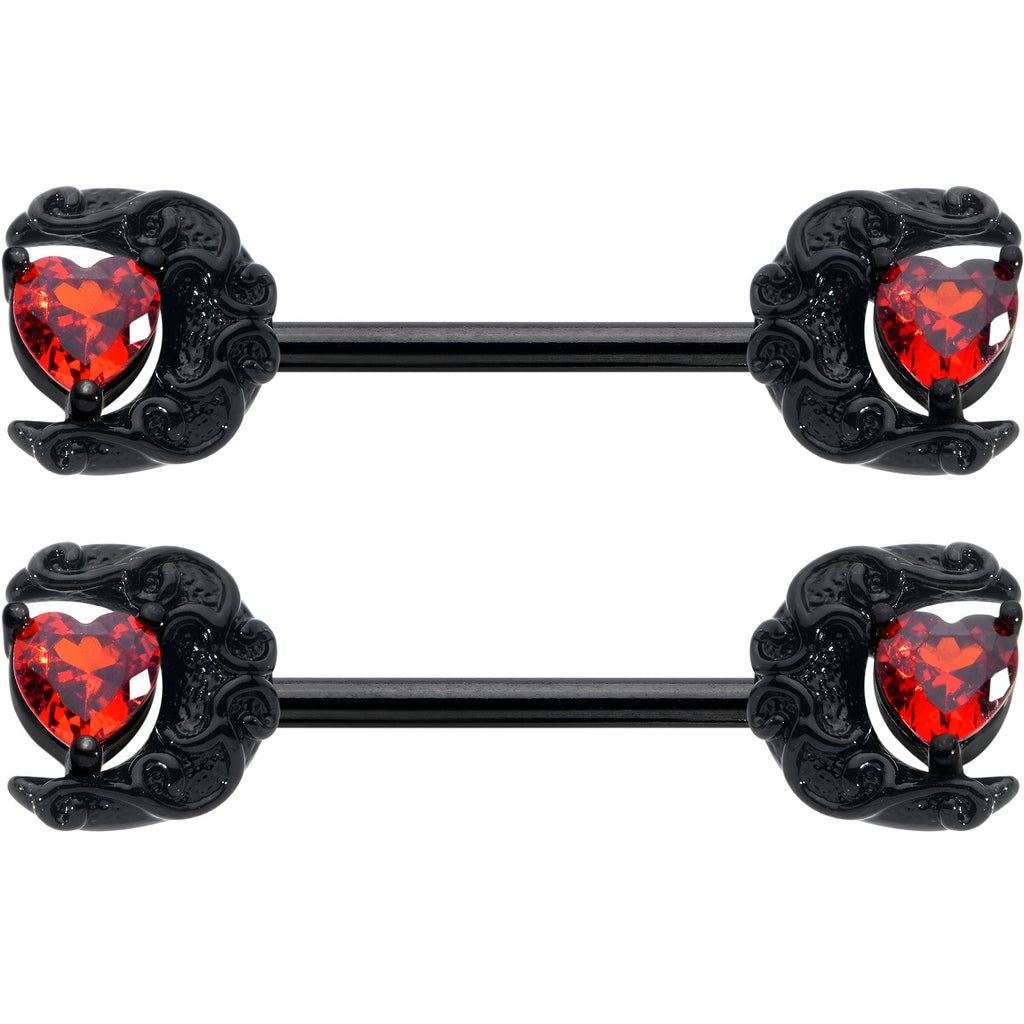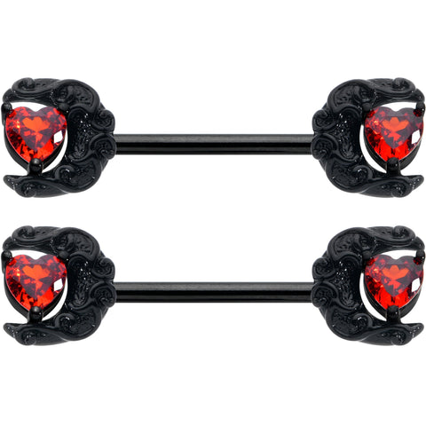 14 Gauge 9/16 Red CZ Gem Black Scroll Moon Heart Barbell Nipple Ring Set