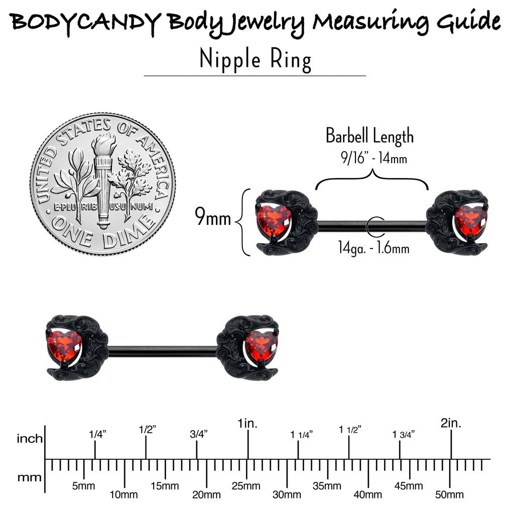 Fall in love with the lunar look of this with this 14 gauge nipple jewelry. It is made with 14mm black PVD over 316L surgical grade stainless steel straight barbells. Each of the ends features a crescent moon charm, covered in raised scrollwork embellishment. At the center of each of the moons is a heart, composed of a red cubic zirconia gem. You will rule the evening sky with these elegant celestial nipple piercing rings. Sold as a set of two.Specifications