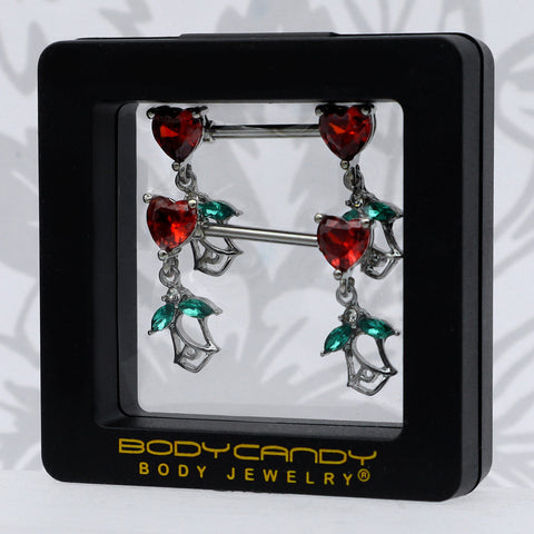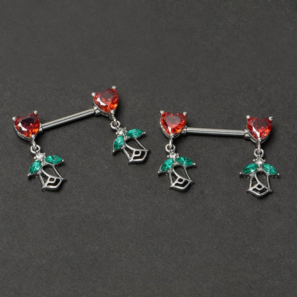 14G 9/16 Red CZ Gem Hearts And Roses Dangle Nipple Ring Set