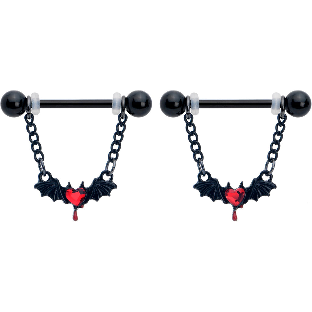 Love the night til it hurts with this 14 gauge nipple jewelry. It's made with 14mm black plated over 316L surgical grade stainless steel straight barbells with 5mm ball ends. Each one features a double length of matching dangling chain. The chains support red gem hearts embellished with black bat wings. They are further embellished with red drip marks to make the hearts look like they're bleeding. You'll love these batty nipple piercing rings to death. Sold as a set of two.