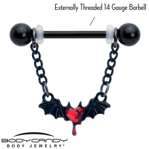14G 9/16 Red Gem Black Bleeding Heart Bat Dangle Nipple Ring Set