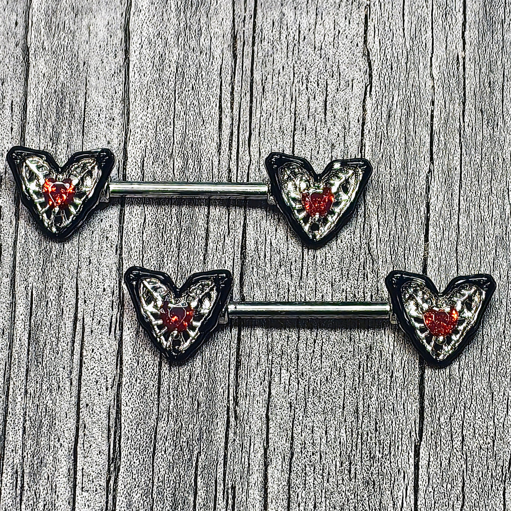 14 Gauge 9/16 Red Gem Captured Heart Barbell Nipple Ring Set