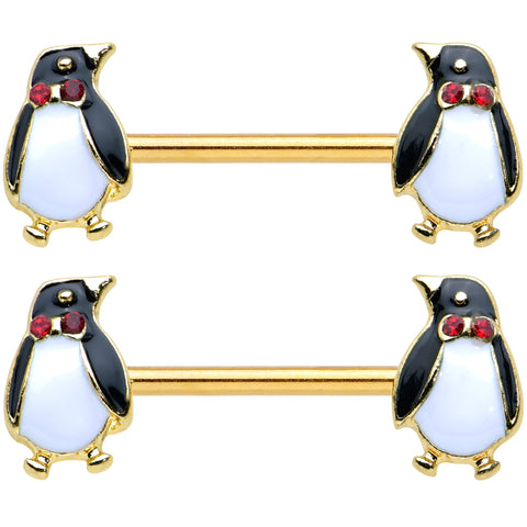 Keep cool this holiday season with this fun 14 gauge nipple jewelry with winter style! It's made with 14mm gold tone PVD over 316L surgical grade stainless steel straight barbells. Each of the ends features a penguin charm, wearing fashionable bow ties with red gem embellishments. It's never too cold to look fabulous with these polished-looking penguin nipple piercing rings! Sold as a set of two.Specifications
