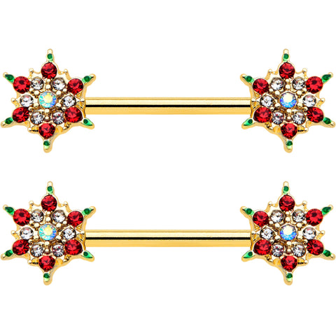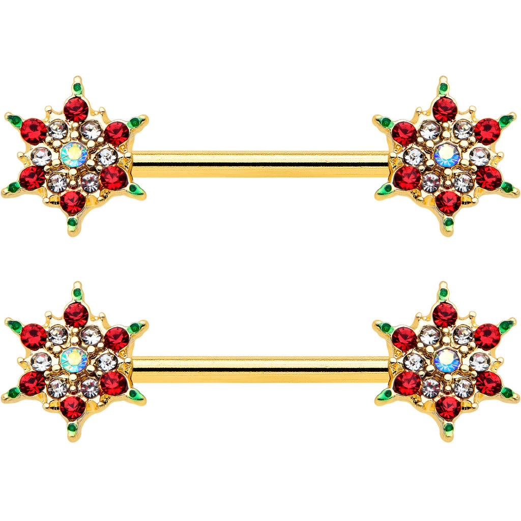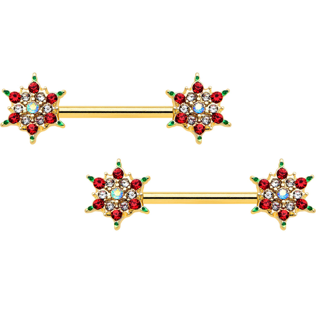 Even if you're not rolling in cash, you can look super rich when you're rocking this 14 gauge nipple jewelry this Christmas! It's made with 14mm gold tone PVD over 316L surgical grade stainless steel straight barbells. Each of the ends features a snowflake charm with rich red gem and green embellishments, connected with a ring of clear gems and finished with an aurora gem center. Whether you're rich or just have upscale taste, these holiday nipple piercing rings will make you feel like a million bucks! Sold as a set of two.Specifications