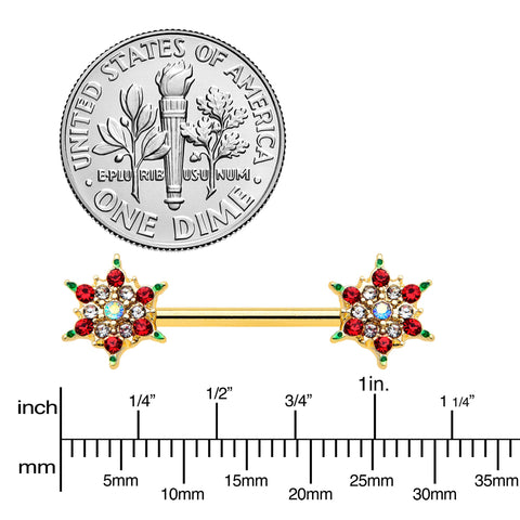 14 Gauge 9/16 Red Gem Gold Hue Bright Christmas Barbell Nipple Ring Set