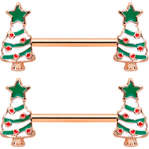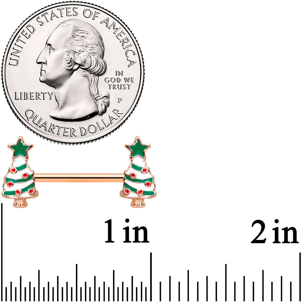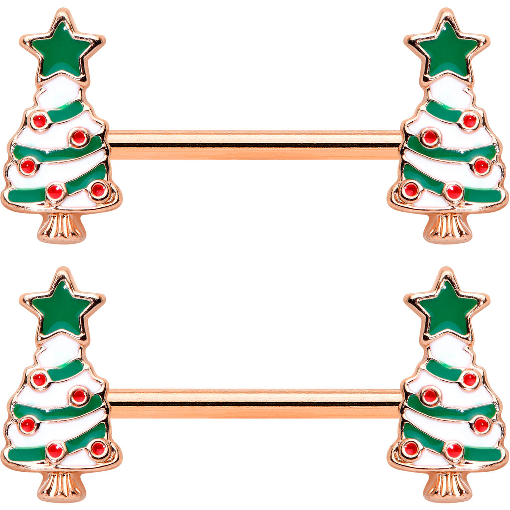 Ooh, Christmas trees, don't you look lovely on this 14 gauge nipple jewelry! It's made with 14mm rose gold tone PVD over 316L surgical grade stainless steel straight barbells. Each of the ends features a Christmas tree charm, with red gem ornaments. The trees are further embellished with green stars on top for a touch of added realism. Give your nipple piercings a Christmas present with these fun and festive Christmas tree nipple piercing rings. Sold as a set of two.Specifications