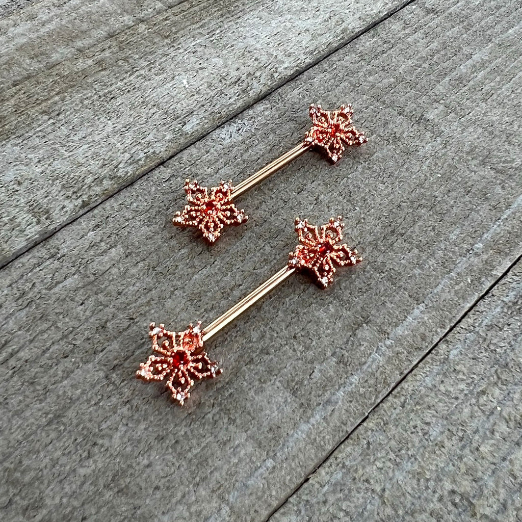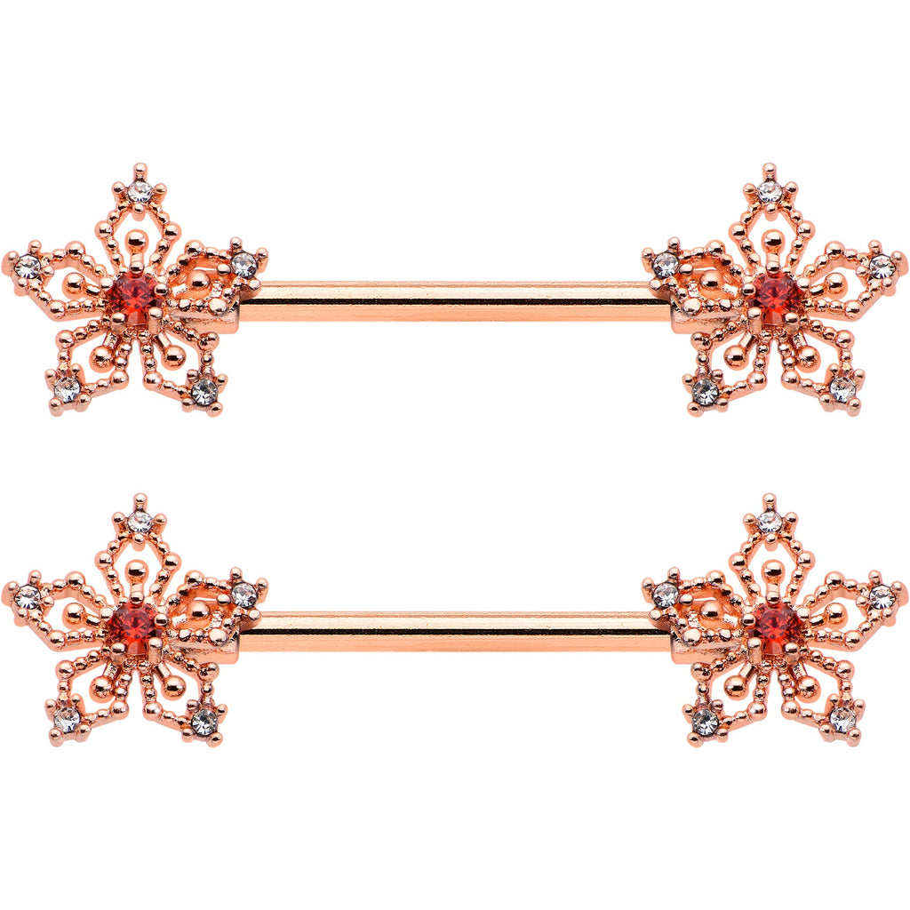 Make your nipple piercings a star this Christmas with this 14 gauge nipple jewelry! It's made with 14mm rose gold tone PVD over 316L surgical grade stainless steel straight barbells. Each of the ends features a snowflake charm, with textured detailing, further embellished with clear gems at the points and a red gem at the center. You'll feel like a star no matter the season with these stylish snowflake nipple piercing rings! Sold as a set of two.Specifications