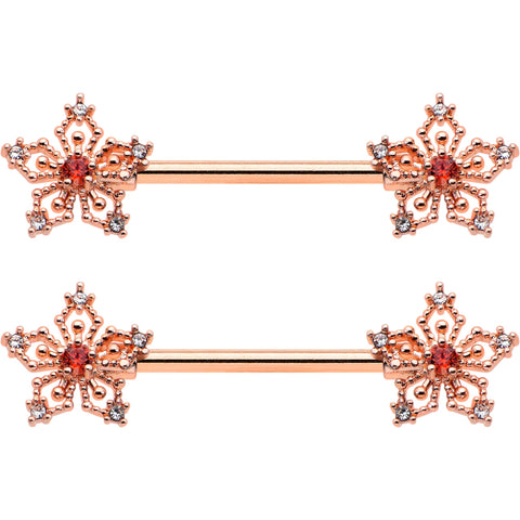 14 Gauge 9/16 Red Gem Rosy Hue Texture Snowflake Barbell Nipple Ring Set