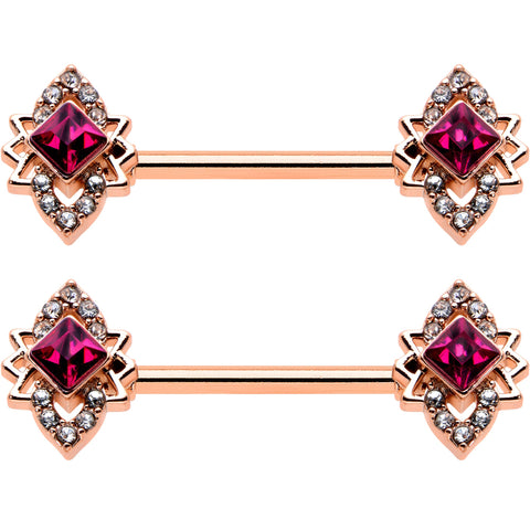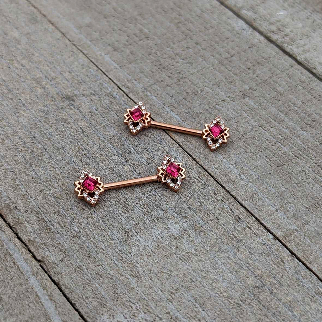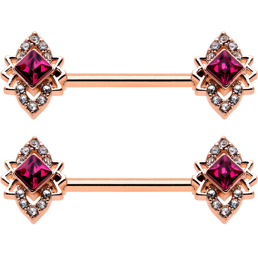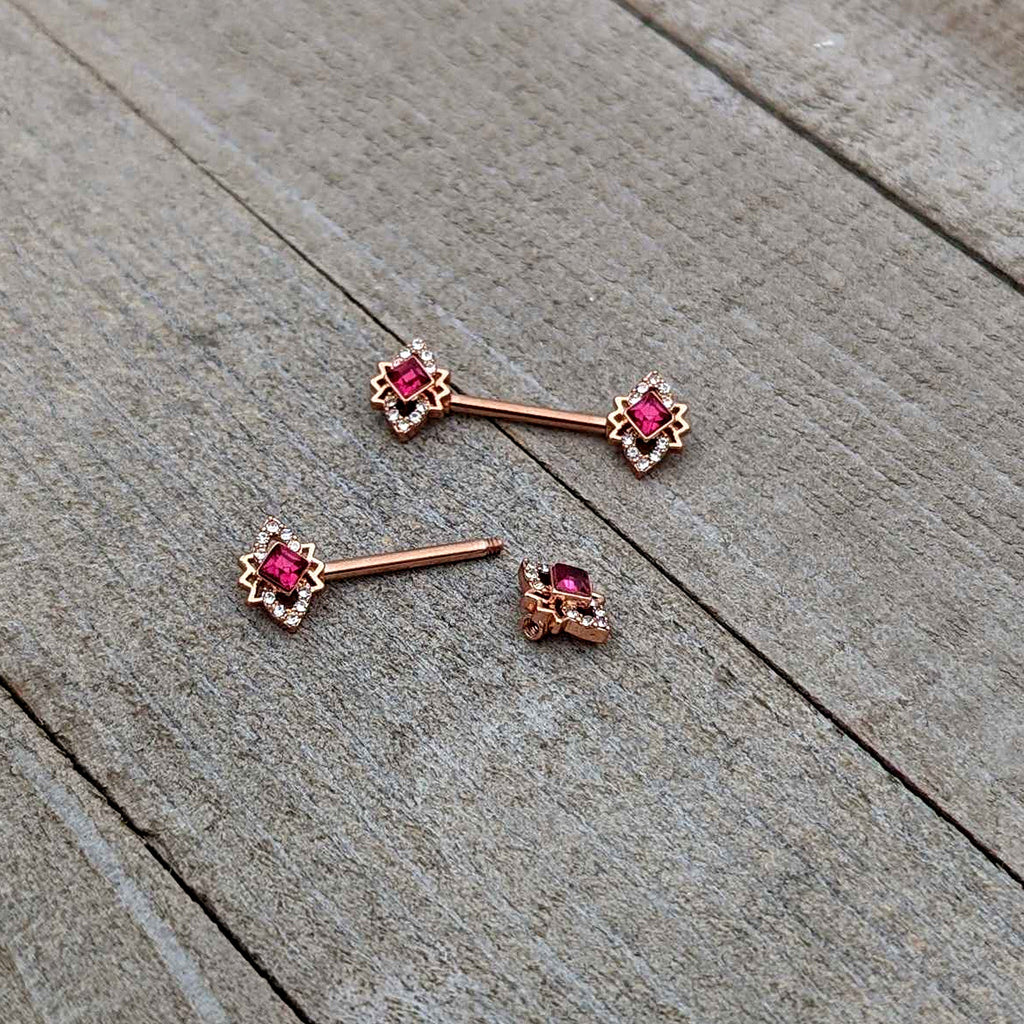 Let your nipple piercings be stars with this 14 gauge nipple jewelry! It's made with 14mm rose gold tone PVD over 316L surgical grade stainless steel straight barbells. Each of the ends features an eight-pointed star charm with a red gem center. They're further embellished with clear gems on the top and bottom points. You'll be the brightest star in the sky when you're rocking these celestial nipple piercing rings! Sold as a set of two.Specifications