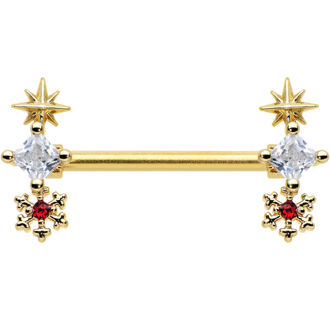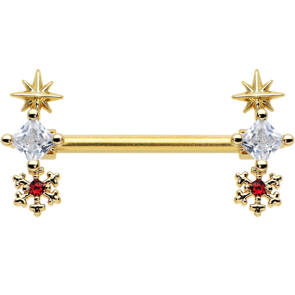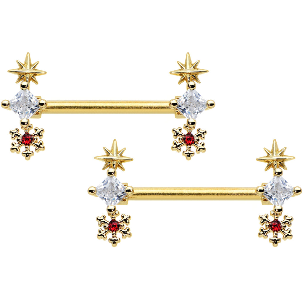Add all the excitement and festivity of Christmas Eve to your look with this 14 gauge nipple jewelry! It's made with 14mm gold tone PVD over 316L surgical grade stainless steel straight barbells. Each of the ends features a snowflake charm, set with a red a gem center. Beneath each one is a clear gem, with a star at the bottom. Get ready to feel the holiday spirit with these elegant star and snowflake nipple rings! Sold as a set of two.