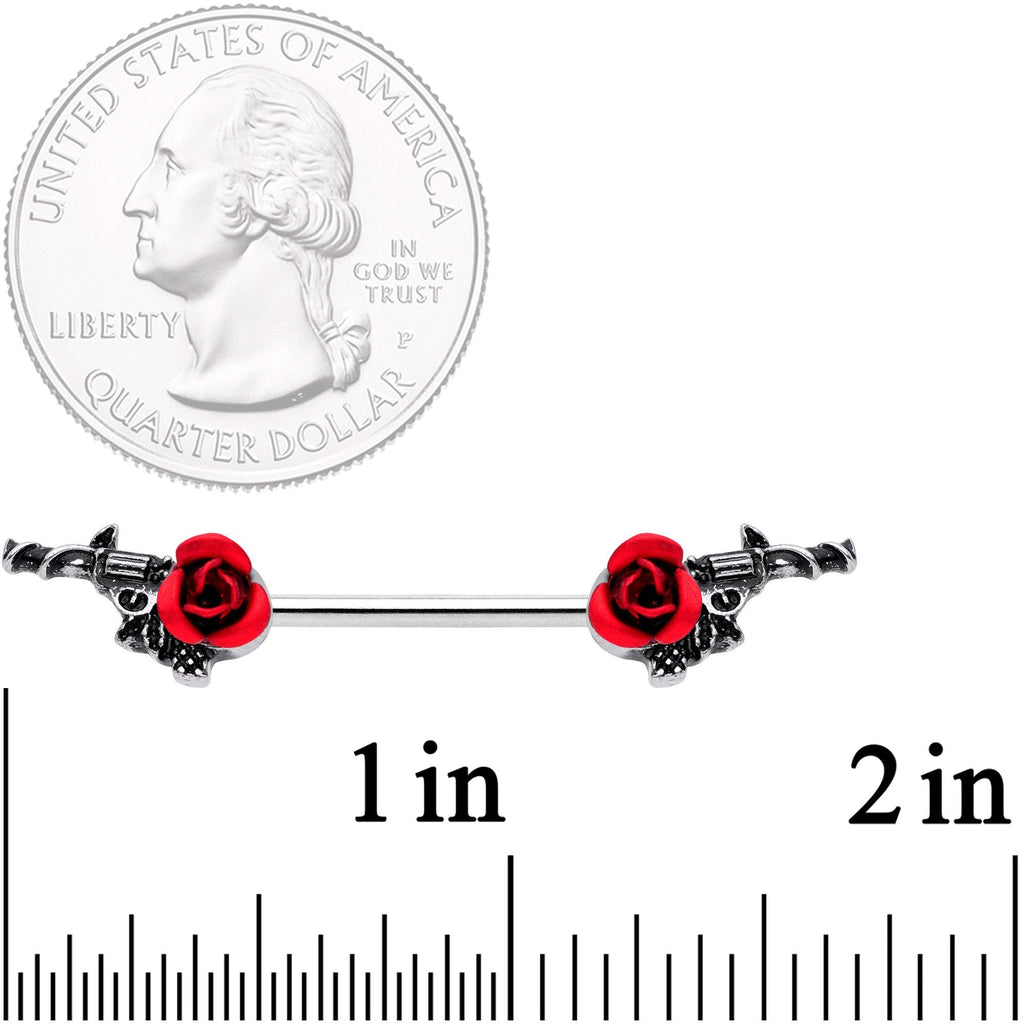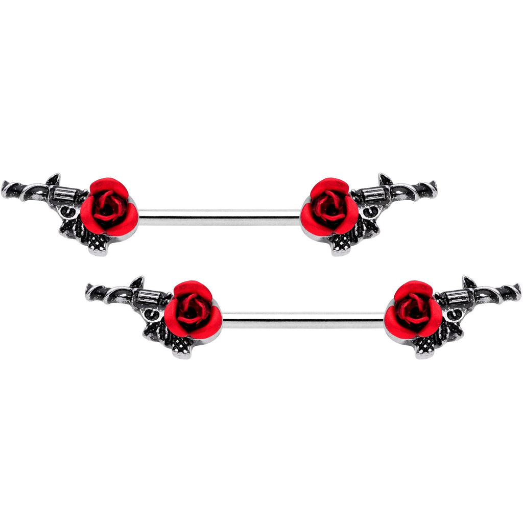 14 Gauge 9/16" Red Rose and Gun Barbell Nipple Ring Set