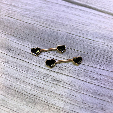 If you have a love of Valentine's day but you're also a little goth then this 14 gauge nipple jewelry is bound to steal your heart! It's made with 14mm rose gold tone plated over 316L surgical grade stainless steel straight barbells. The ends feature black heart-shaped charms embellished with textured edging for a look that has visual impact while retaining its edgy appearance. Let your love of the night come out to play with these beautiful dark heart nipple rings.Specifications