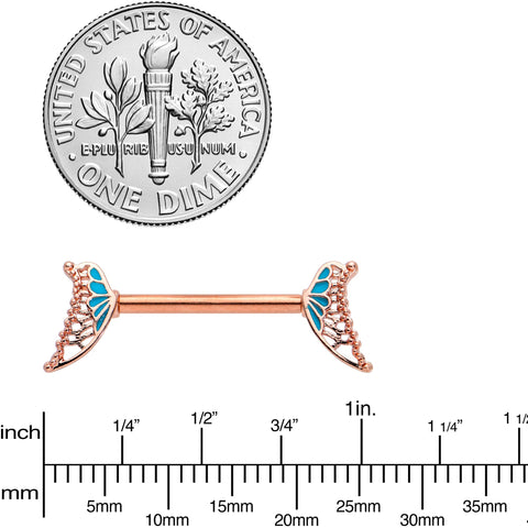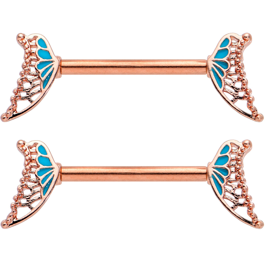 14 Gauge 9/16 Rose Gold Tone Blue Butterfly Wing Nipple Ring Set