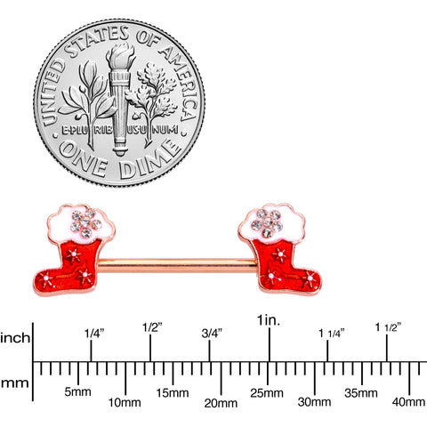 This holiday season, don't forget to hang your stockings with this 14 gauge nipple jewelry! It's made with 14mm rose gold tone PVD over 316L surgical grade stainless steel straight barbells. Each of the ends features a red and white stocking charm, embellished with clear gems to add an extra bit of style to your season! Classic and contemporary, these stocking nipple rings are the perfect gift for your nipple piercings! Sold as a set of two.Specifications