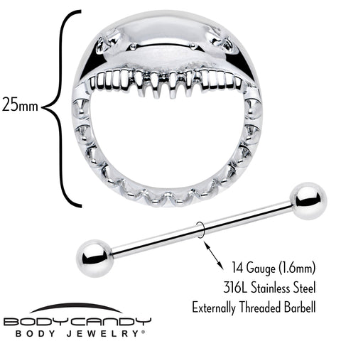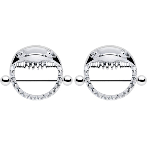 You're gonna need a bigger jewelry box....to add this 14 gauge nipple jewelry to your collection. It's made with 14mm durable 316L surgical grade stainless steel straight barbells with 5mm ball ends. The shield portions features shark heads, with their open mouths embellished with terrifying teeth detailing. Whether you're on dry land or the open water, the jaws on these shark nipple piercing rings are sure to turn heads. Sold as a set of two.Specifications