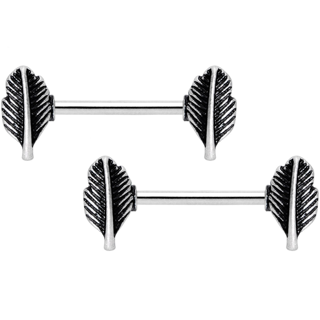 Perhaps a little bird wanted to whisper in your ear...but it seems to have flown away and left some feathers behind. This 14 gauge set of nipple piercings is made with 14mm durable 316L surgical grade stainless steel straight barbells. The ends feature a feather with engraved details in a simple but clear style that is both visually elegant and timeless. That little birdie may have flown the coop but it left behind some very stately style for you to wear in your nipple piercings! Sold as a set of two,