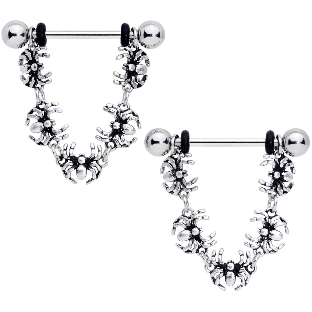 What could be spookier than spiders? A whole string of spiders, like the ones dangling from this 14 gauge nipple jewelry! It's made with 14mm durable 316L surgical grade stainless steel straight barbells with 5mm ball ends. Hanging from the barbells is a dangling strand, composed entirely of spider charms. The spiders are burnished to make their details really catch the eye. And they include black rubber o-rings so you can adjust the spidery strand and get just the look you're after. This Halloween, let these nipple rings catch you in their web! Sold as a set of two.Specifications