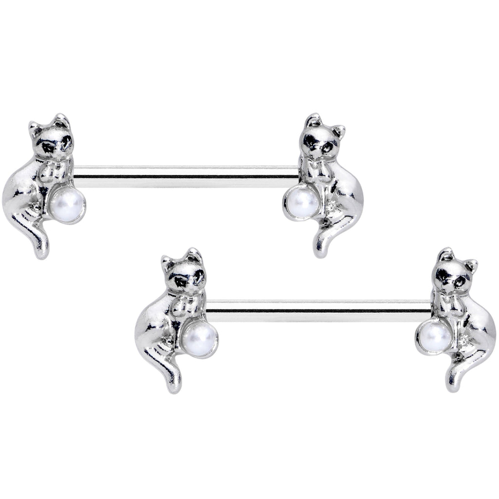 These cool cats are all ready to play ball! These 14 gauge nipple rings are made with 14mm durable 316L surgical grade stainless steel straight barbells. The ends each feature a cat charm with raised detailing for added visual impact. Each cat has a white pearlescent ball by its feet, as though it's just looking for someone to play with. Whether you're looking for simple style or are crazy for cats, this nipple jewelry will have you feeling like one cool kitty! Sold as a set of two.Specifications