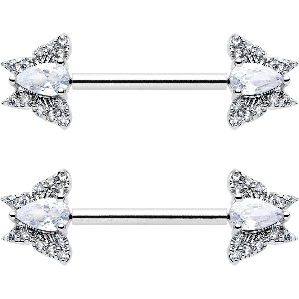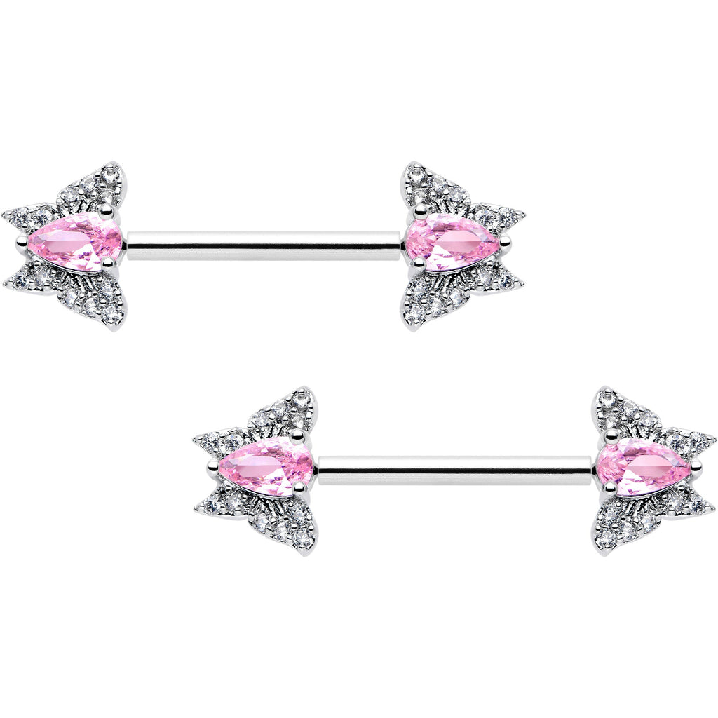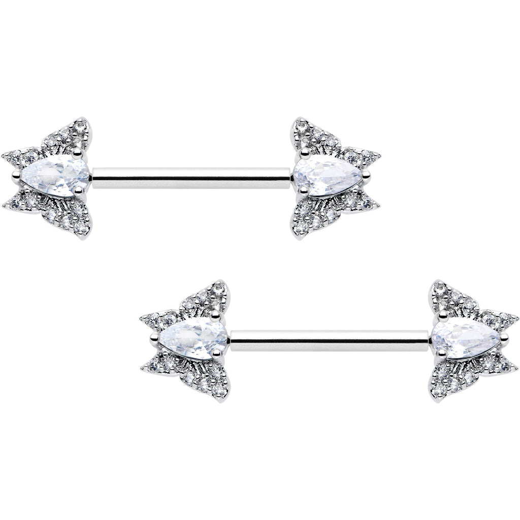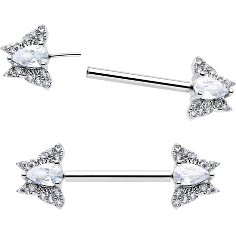 Each of the ends features a butterfly charm, with wings set with cubic zirconia gems. The butterfly is further embellished with a matching cubic zirconia gem body for an ornate appearance. These opulent butterfly nipple piercing rings will make you want to fly. Sold as a set of two.