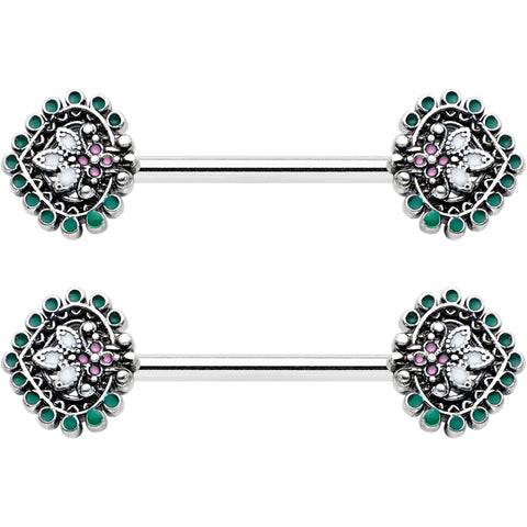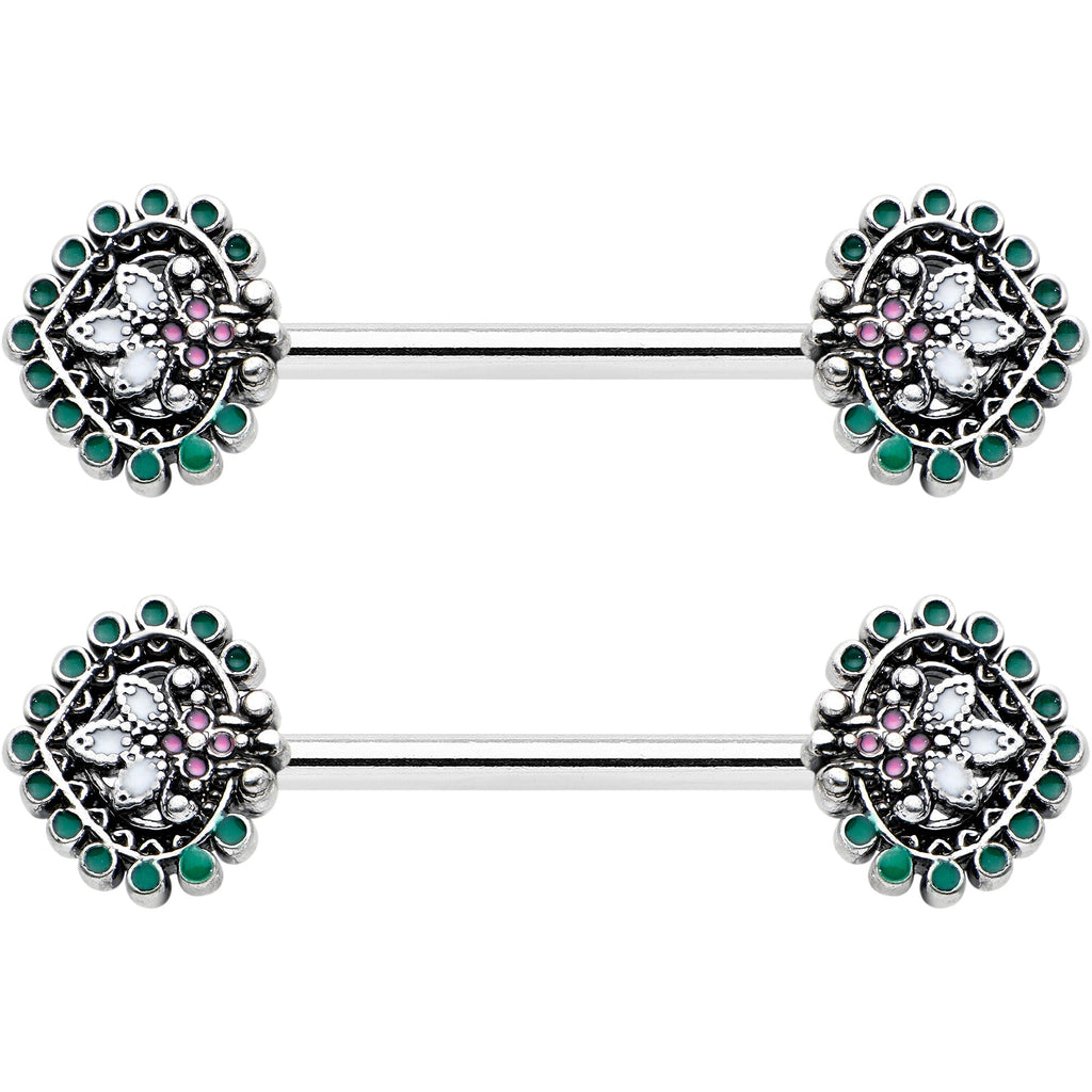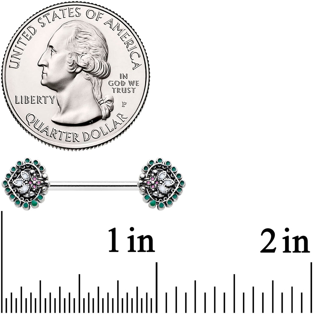Stylize your look with this 14 gauge nipple jewelry! It's made with 14mm durable 316L surgical grade stainless steel straight barbells. Each of the ends features a leaf charm composed of colorful ovals. The central ovals are set with white and pink inlay and the whole charm is surrounded by green embellishment. It's further embellished with textured detailing, burnished to make all the details pop. Add some abstract style to your look with these elegant, opulent nipple piercing rings. Sold as a set of two.Specifications