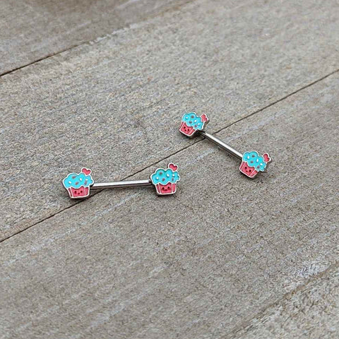 Give your nipple piercings a delicious new look with this 14 gauge nipple jewelry! It's made with 14mm durable 316L surgical grade stainless steel straight barbells. Each of the ends features an inlaid cupcake charm, with blue frosting and pink and white sprinkled embellishments. The cupcakes each have a pink base featuring a cheerful face. You'll have the yummiest looking nipple piercings around with these tasty cupcake nipple piercing rings! Sold as a set of two.Specifications