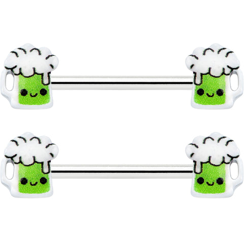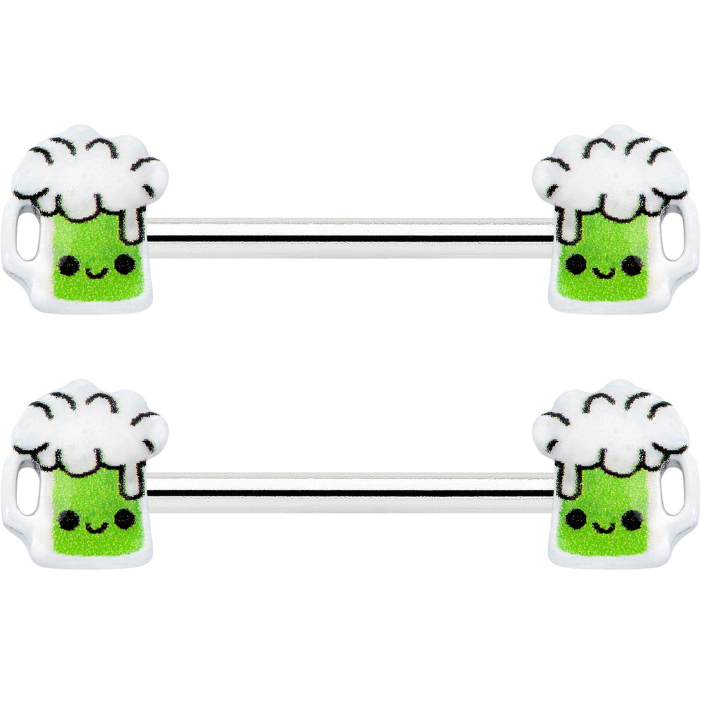 This St Patrick's Day, belly up to the bar with this 14 gauge nipple jewelry! It's made with 14mm durable 316L surgical grade stainless steel straight barbells. Each of the ends features a green beer charm, with a happy little face on each one. If you're looking for a bit of green to wear this St. Patrick's Day, have no fear - we've got some beer for your nipple piercings with this festive nipple piercing jewelry! Sold as a set of two.