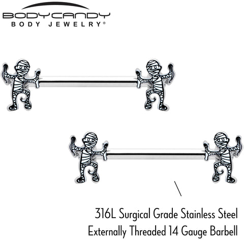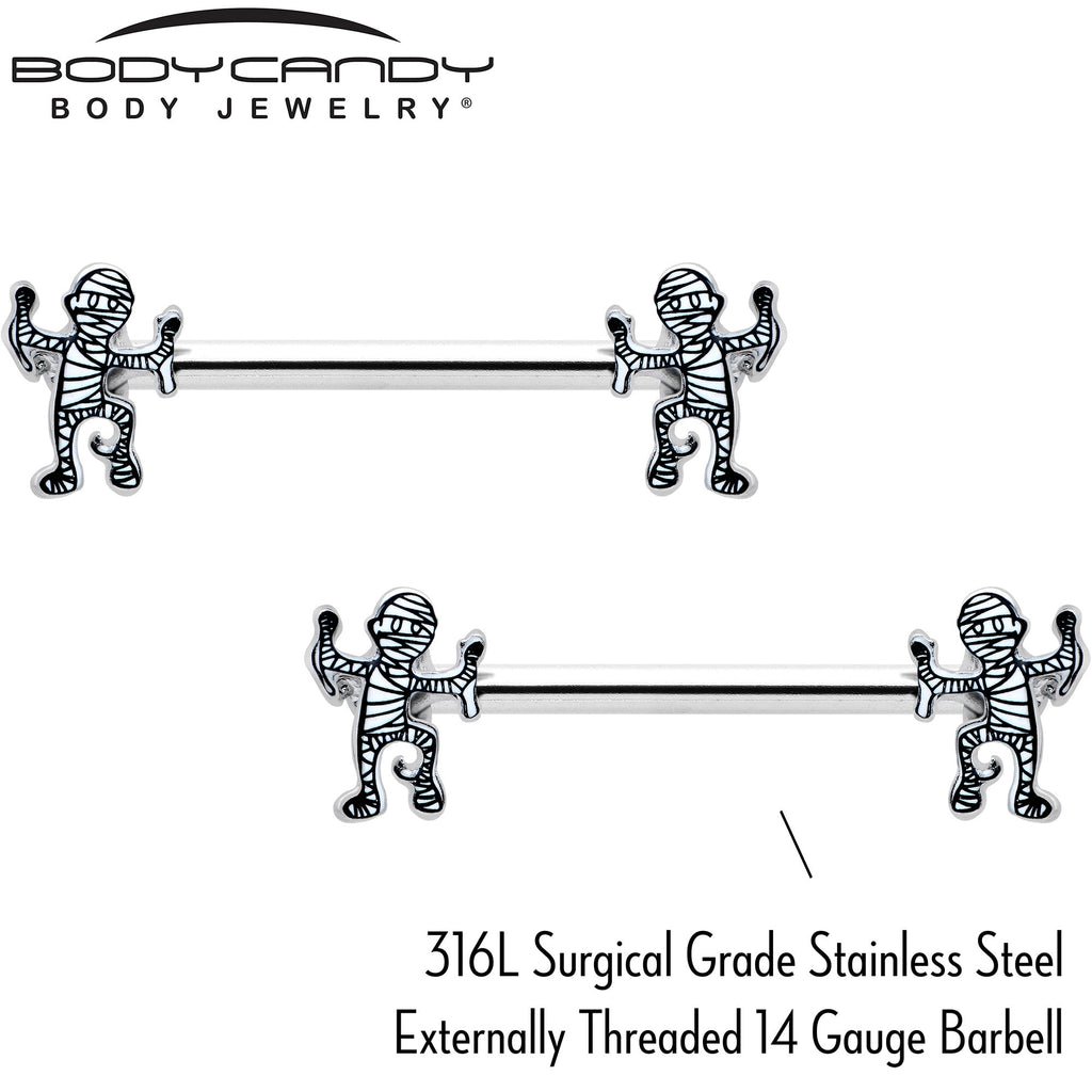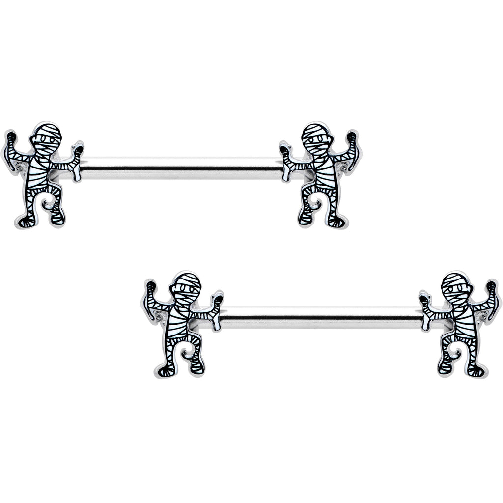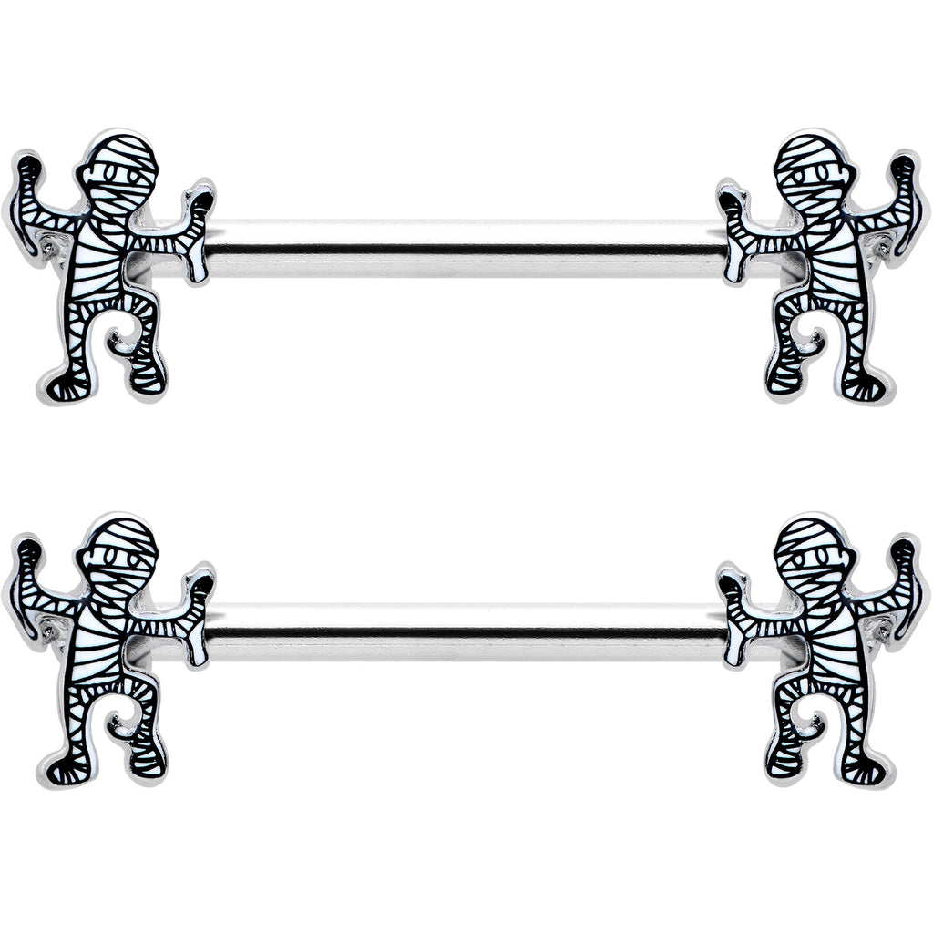 The mummies on this 14 gauge nipple jewelry will definitely give you a Halloween thrill. It's made with 14mm durable 316L surgical grade stainless steel straight barbells. Each of the ends features a mummy charm white wrappings and black detailing, arms spread as though they're ready to grab someone and one leg lifted as if caught in mid-stride. With graphic styling and creepy detail, the mummies on these nipple piercing rings will have your piercings looking petrifying. Sold as a set of two.