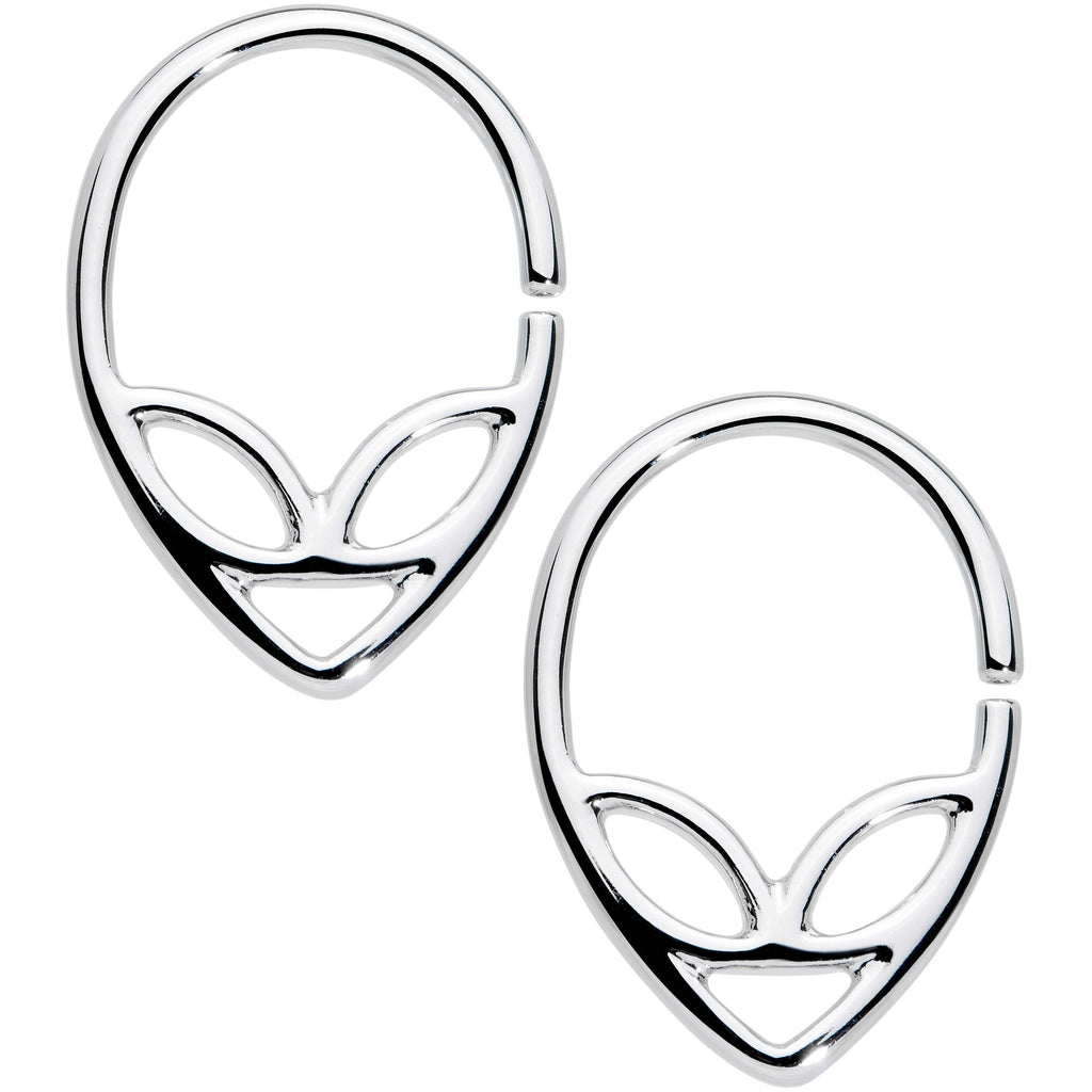 Finish your look with something stellar when you wear these 14 gauge alien nipple rings. Made with rhodium plated over brass, each one is made in the shape of an alien's face and they are super easy to insert and remove. Just give them a light twist, insert them into your piercing and gently bend them closed. This nipple jewelry is absolutely out of this world because it can be worn in piercings like your nipples, septum, some stretched lobes, and helix piercings too! Sold as a set of two.