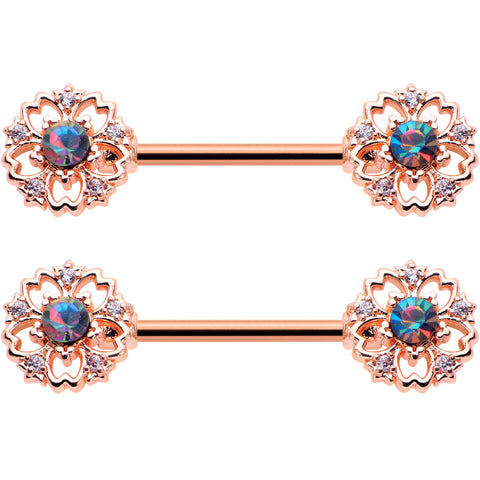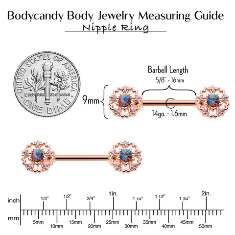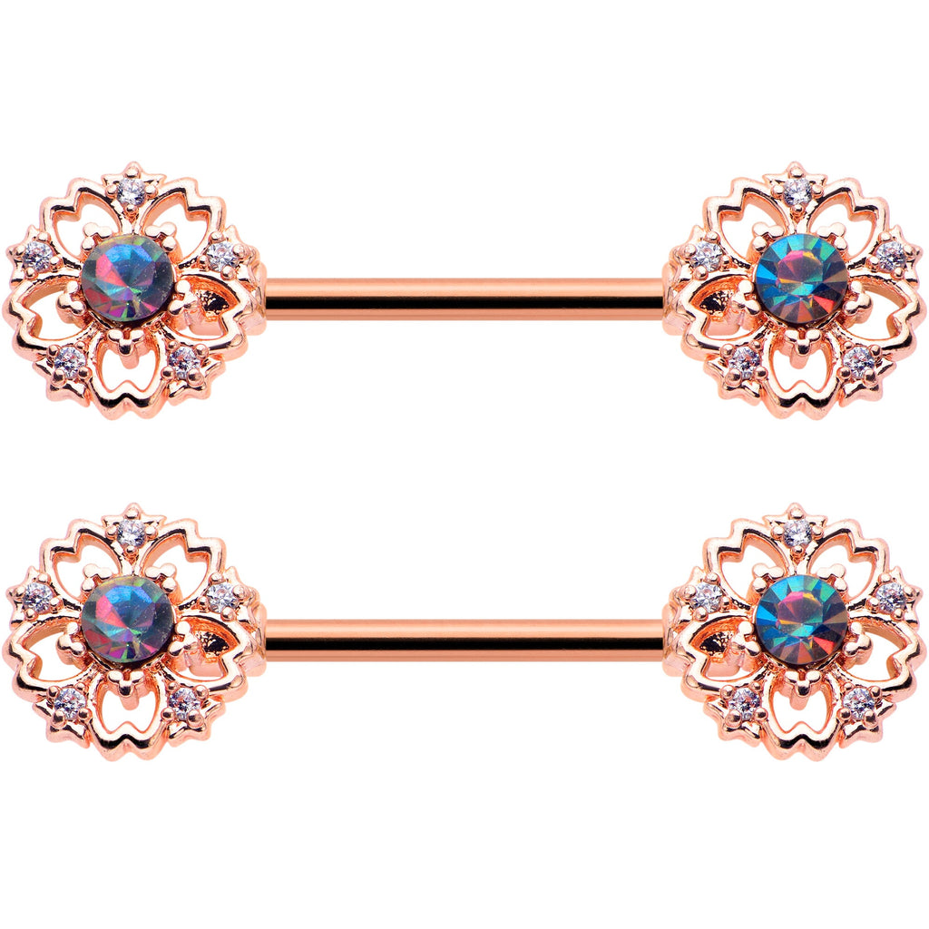The elegant floral design on this 14 gauge nipple jewelry is absolutely eye catching. It is made with 14mm rose gold tone PVD over 316L surgical grade stainless steel straight barbells. Each of the ends features a flower charm with a vitrail gem center. They are further embellished with clear gems along the edge for added style. You are sure to feel gorgeous when you are rocking these elegant, floral nipple piercing rings. Sold as a set of two.Specifications