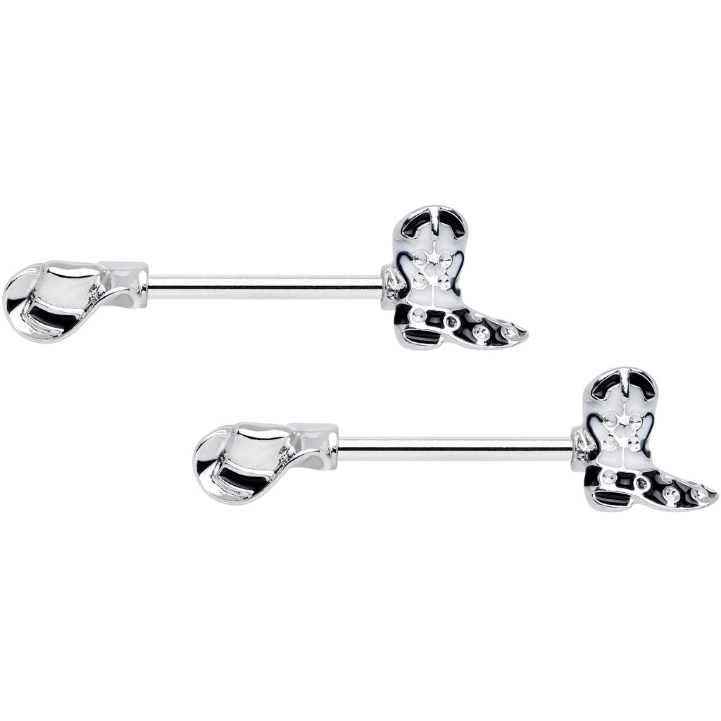 Hey there cowpoke, you're going to want to lasso up this 14 gauge nipple jewelry! It's made with 14mm durable 316L surgical grade stainless steel straight barbells. One end features a traditional cowboy hat charm instantly recognizable with its simple and classic style. The other end is a cowboy boot charm in a more ornate style with black embellishment that makes every detail really pop. Even if you've never been near a horse in your life, you can look the part with these Western-themed nipple rings! Sold as a set of two.Specifications