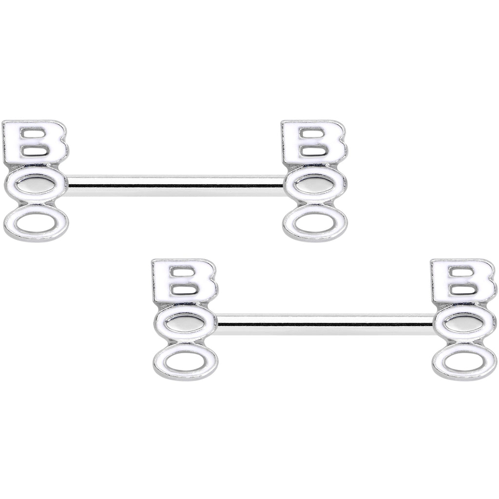 Give your look a little jump scare with this 14 gauge Halloween nipple jewelry! It's made with 14mm durable 316L surgical grade stainless steel straight barbells. Each of the ends features a charm of the word "boo!" in white, ghostly lettering with the letters stacked vertically. This boo is sure to beautify your Halloween look! Sold as a set of two.Specifications