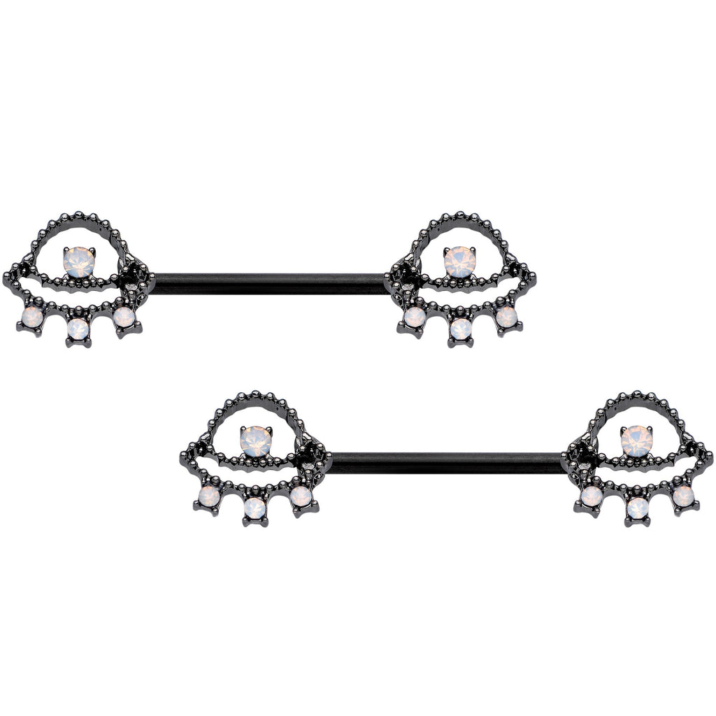 14 Gauge 9/16 White Faux Opal Black UFO Barbell Nipple Ring Set