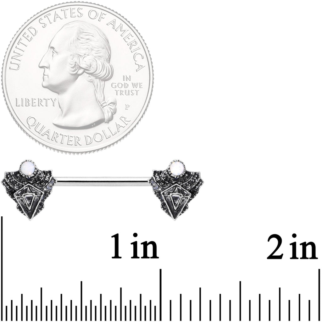 This 14 gauge nipple piercing set packs old-world style into a piece of body jewelry that is unmistakably NOW. They're made with 14mm durable 316L surgical grade stainless steel straight barbells. The ends feature an art deco design of geometric shapes, on a darkened background to really bring out every intricate detail, and topped with a white faux opal for contrast and visual impact. If ladies in days gone by had pierced nipples, this is exactly the sort of jewelry they'd have worn in them! Sold as a set of two.