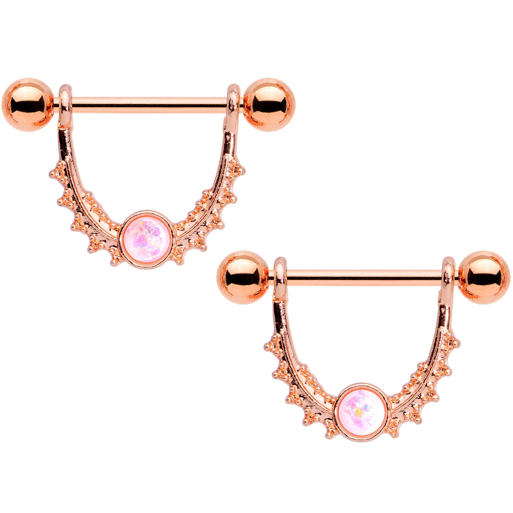 The simple elegance of these 14 gauge nipple jewelry combines simple elegance with architectural detail for a look that's supremely sophisticated! They're made with 14mm rose gold tone plated over 316L surgical grade stainless steel straight barbells with 5mm ball ends. The dangle portion has a 9mm rise. It features simple, textured embellishment for a clean appearance that is crowned with a white faux opal for a finish that's totally on-trend. Take your style to a new, grown-up level with these delightfully refined nipple rings! Sold as a set of two.Specifications