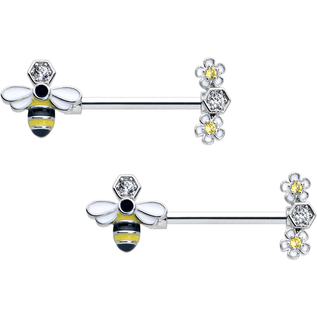 You'll bee the hottest bee in the hive with this 14 gauge nipple jewelry. It's made with 14mm durable 316L surgical grade stainless steel straight barbells. One end features a pair of matching flowers with yellow cubic zirconia centers on each side of a single honeycomb charm with a clear cubic zirconia gem center. The other end features a bee charm with black and yellow stripes and white wings, topped with a clear cubic zirconia gem. Whether you're a worker, a drone, or the queen, you'll be the sweetest looking honey in the room with these elegant honeybee nipple piercing rings. Sold as a set of two.