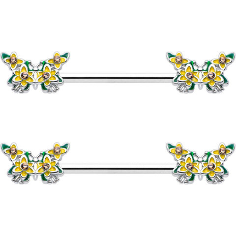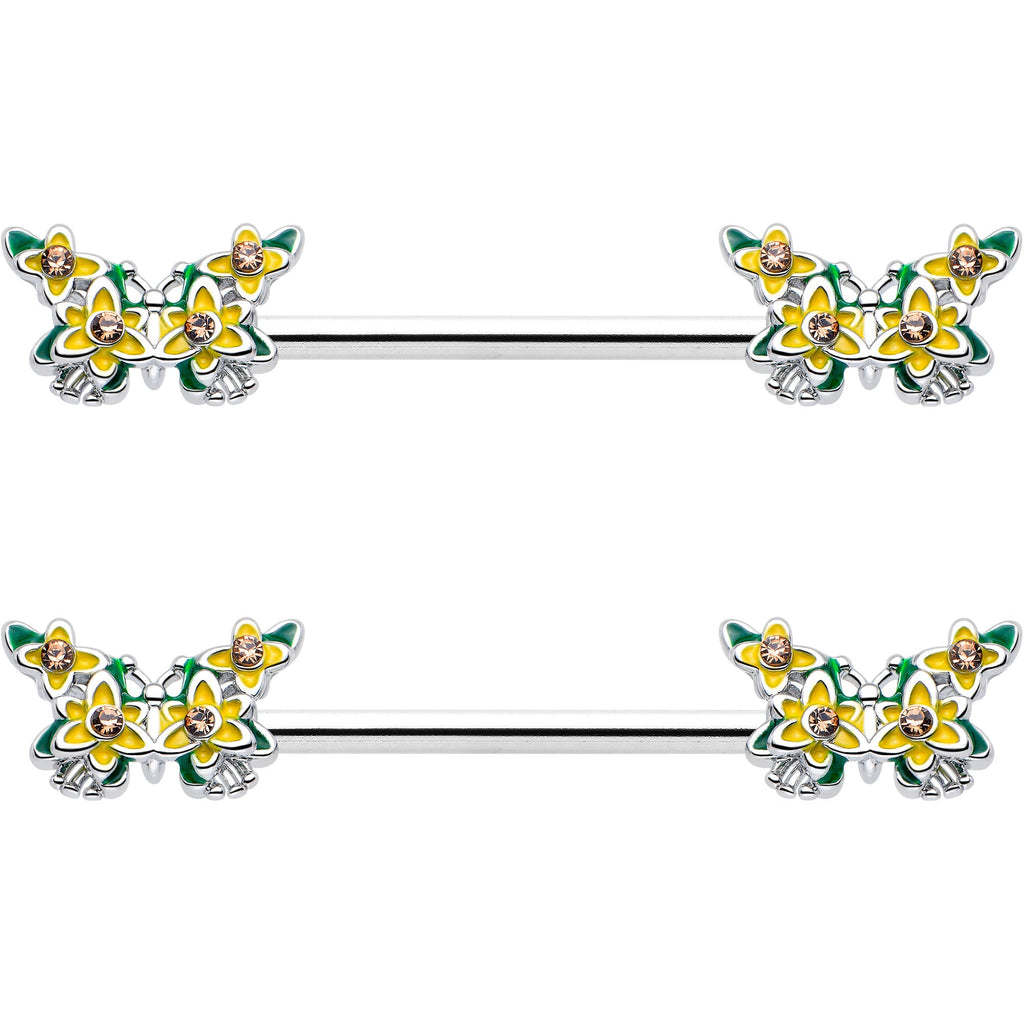 Let your look blossom into something totally new with this 14 gauge nipple jewelry. It's made with 14mm durable 316L surgical grade stainless steel straight barbells. Each of the ends features a butterfly charm, with the butterfly's wings entirely composed of green leaves and yellow flowers. The flowers are further embellished with yellow cubic zirconia gem centers. Spread your wings and fly into style with these fabulous, floral, butterfly nipple piercing rings. Sold as a set of two.Specifications