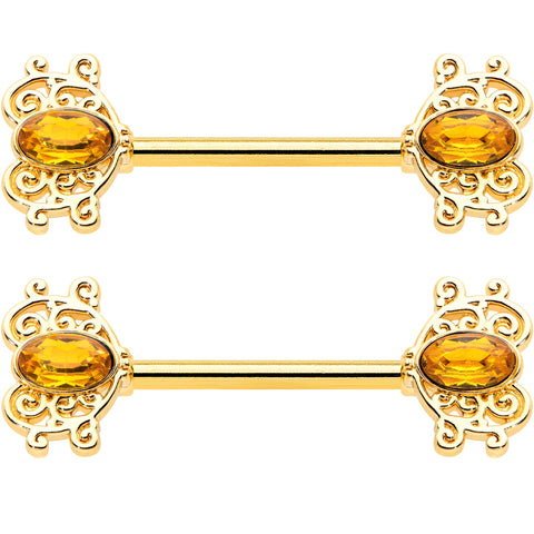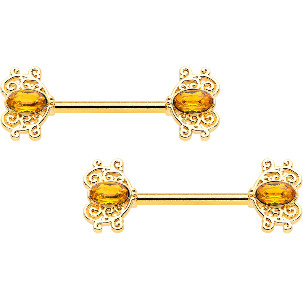You'll be totally golden with this 14 gauge nipple jewelry! It's made with 14mm gold tone PVD over 316L surgical grade stainless steel straight barbells. The end each feature scrollwork charms, with a light and airy appearance. They're further embellished with yellow gems for a look that can't help but be noticed! Bring your nipple piercings into a golden age of style with these scintillating scrollwork nipple piercing rings! Sold as a set of two.Specifications