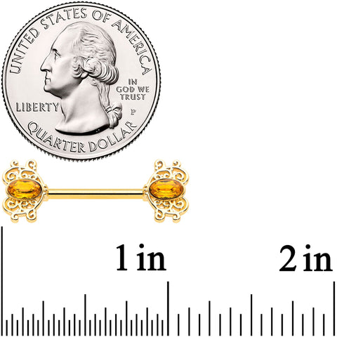 14 Gauge 9/16 Yellow Gem Gold Hue Duet Scroll Barbell Nipple Ring Set