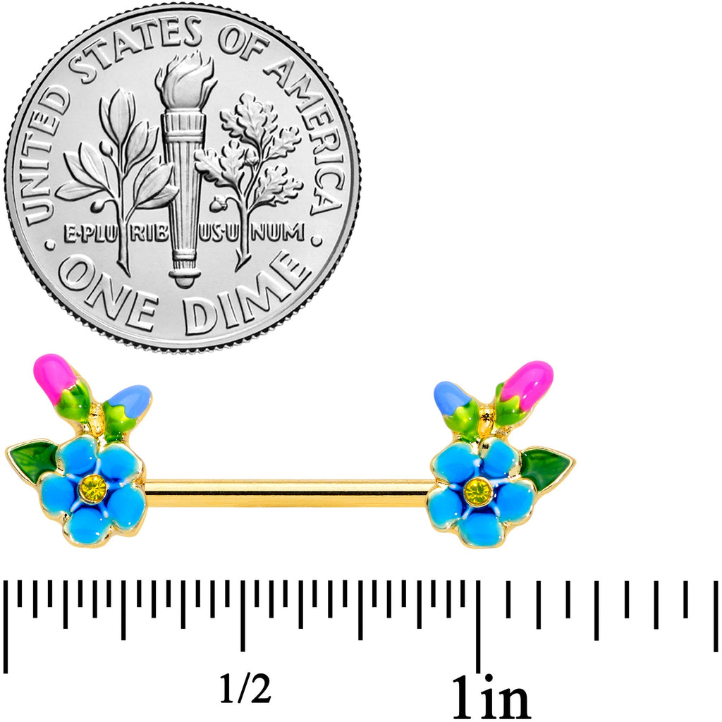 Brighten up your day with the bright, poppy colors of this 14 gauge nipple jewelry! It's made with 14mm gold tone PVD over 316L surgical grade stainless steel straight barbells. The ends feature flower charms with bright aqua petals and a yellow gem set at their centers. The flowers also have a green leaf and are further embellished with a pair of buds underneath in intense lavender and knock-your-socks-off hot pink! If you're searching for a way to add color and style to your nipple piercings, grab your garden shears and pick a pair of neon posies with the concentrated colors of these floral nipple rings! Sold as a set of two.