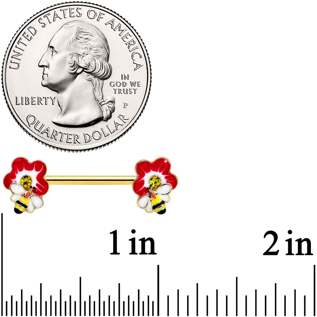 Let your nipple piercings feel like queen bees with this 14 gauge nipple jewelry. It's made with 14mm gold tone plated over 316L surgical grade stainless steel straight barbells. Each of the ends features a flower charm with red and white petals and a yellow gem center. The flower is embellished with a queen bee perched on it, indentifiable by the red dot on her back. Feel like the queen of the hive with these charming floral nipple piercing rings! Sold as a set of two.